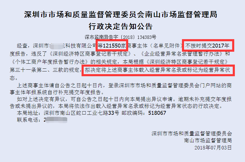 深圳市市場監(jiān)督管理局會定期公示即將納入異常的企業(yè),若公告之日起十日內(nèi)未提出異議申請解決的將被載入經(jīng)營異常名錄或標(biāo)記為經(jīng)營異常狀態(tài),深圳很多老板公司注冊下來置之不理,不經(jīng)營也不注銷,根據(jù)《深圳經(jīng)濟特區(qū)商事登記若干規(guī)定》《深圳經(jīng)濟特區(qū)商事主體經(jīng)營異常名錄管理辦法》,深圳公司以下兩種情況最容易被納入異常名錄,分別為: