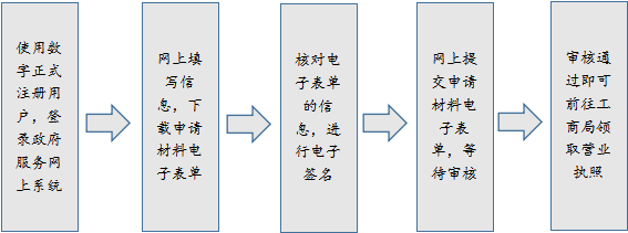 (3)核名通過之后便可以在線填寫企業設立申請信息,需要的信息:法人、股東的出資比例,資金到位年限,公司經營年限,總經理、董事、監事的分工,公司地址(可以是住宅樓,只要確定每年能收到工商發來的函件確定地址)。提交之后下載PDF,用數字證書進行電子簽名,簽好名右上角遞交申請就可以了。