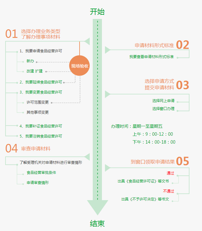 新辦食品經(jīng)營許可證,變更食品經(jīng)營許可證主體業(yè)態(tài)或經(jīng)營項(xiàng)目,改建、擴(kuò)建食品經(jīng)營場(chǎng)所,首先提出現(xiàn)場(chǎng)驗(yàn)收申請(qǐng),現(xiàn)場(chǎng)驗(yàn)收通過后,憑現(xiàn)場(chǎng)驗(yàn)收核查意見和其它申請(qǐng)材料在意見出具之日起20個(gè)工作日內(nèi)申請(qǐng)辦理食品經(jīng)營許可證,逾期須重新申請(qǐng)現(xiàn)場(chǎng)驗(yàn)收。