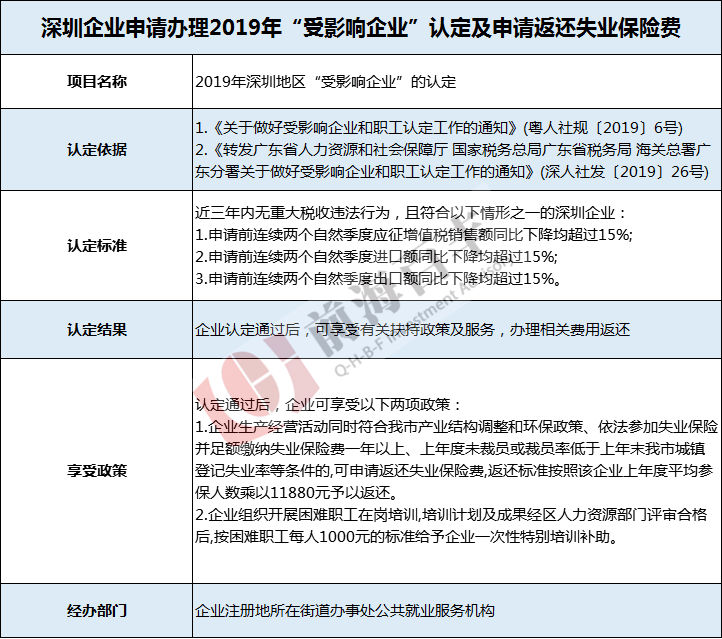 根據(jù)《轉(zhuǎn)發(fā)廣東省人力資源和社會(huì)保障廳 國(guó)家稅務(wù)總局廣東省稅務(wù)局 海關(guān)總署廣東分署關(guān)于做好受影響企業(yè)和職工認(rèn)定工作的通知》(深人社發(fā)〔2019〕26號(hào)),若深圳企業(yè)被認(rèn)定為“受影響企業(yè)”,可以享受包括“申請(qǐng)返還失業(yè)保險(xiǎn)費(fèi)”和“在職困難員工一次性特別困難補(bǔ)助”,具體通知介紹請(qǐng)參見前海百豐說(shuō)明圖所示。