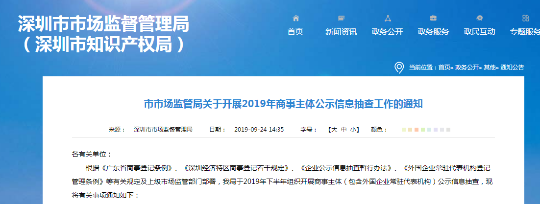 今年9月份深圳市市場監督管理局依據下發《關于開展2019年商事主體公示信息抽查工作的通知》,已經組織開展商事主體(包含外國企業常駐代表機構)公示信息抽查,下面我們來講一下相關關事項: