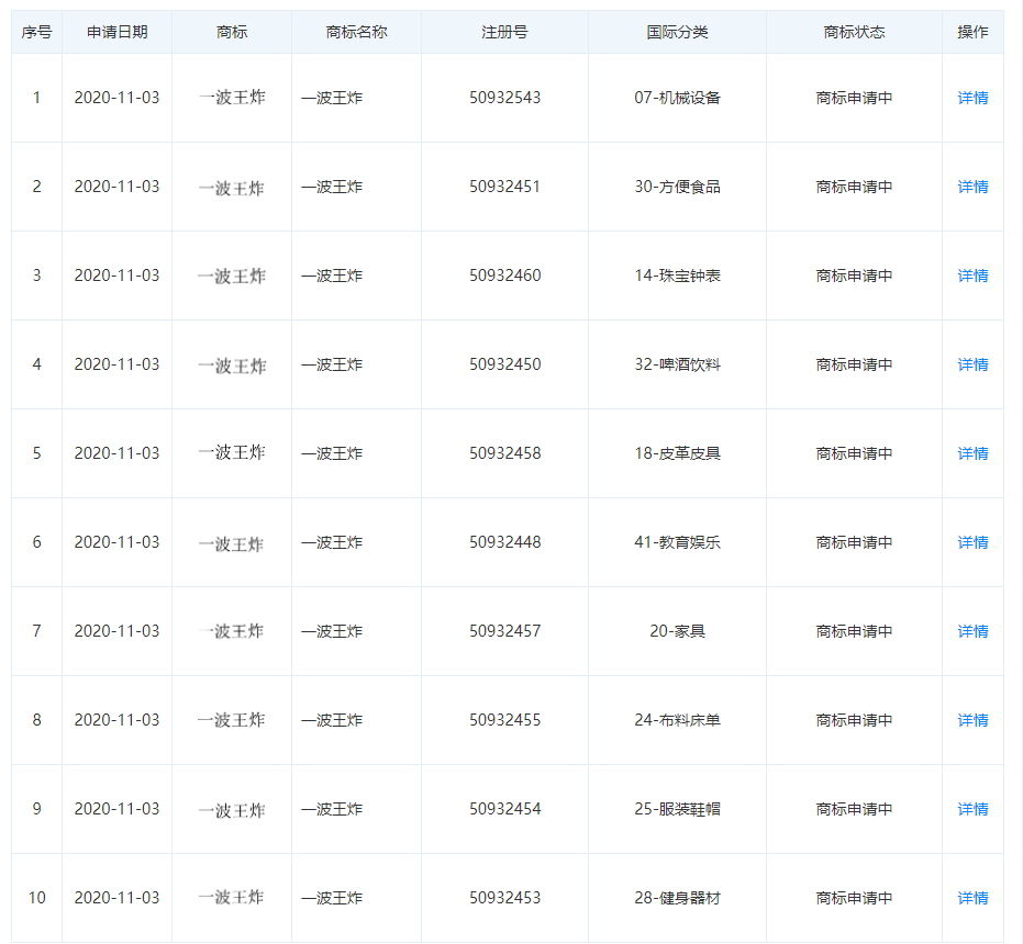 近日,北京樂華圓娛文化傳播股份有限公司申請注冊數條“一波王炸”商標,申請日期均為11月3日,商標注冊商標狀態均為商標申請中,國際分類涉及食品、廣告銷售、日化用品、啤酒飲料、教育娛樂等。公開資料顯示,“一波王炸”為2020年《這就是街舞》冠軍隊伍、樂華娛樂旗下藝人王一博戰隊隊名。