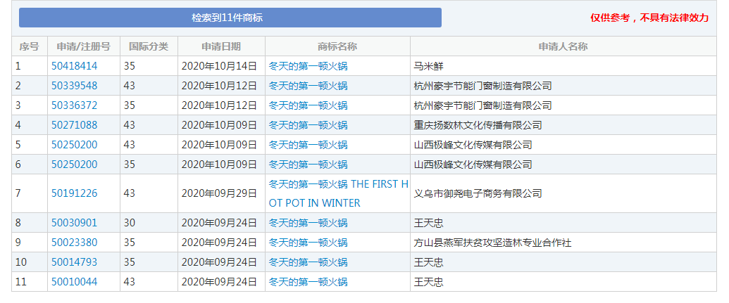 近日,“冬天的第一頓火鍋”也被注冊成商標。申請人包括杭州豪宇節能門窗制造有限公司、山西極峰文化傳媒有限公司、重慶揚數林文化傳播有限公司、義烏市御堯電子商務有限公司等。國際分類包括餐飲住宿、廣告銷售,以上申請商標狀態絕大多數仍處于等待實質審查。