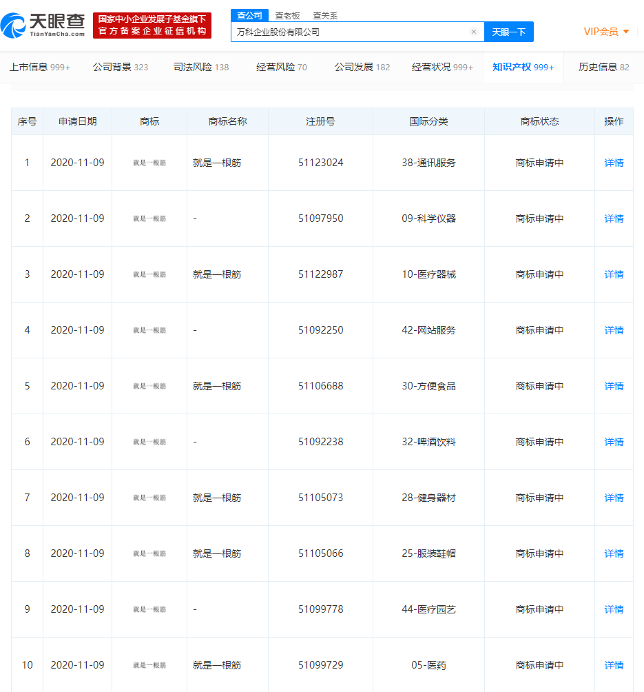 近日,萬科企業股份有限公司申請多條“就是一根筋”商標,申請日期均為11月9日,商標狀態為“商標申請中”,分類涉及通訊服務、科學儀器、服裝鞋帽等。