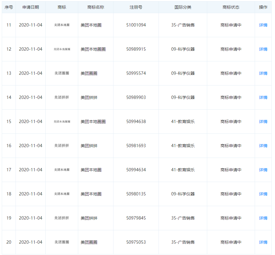 近日,美團關聯公司北京三快科技有限公司申請“美團拼拼”、“美團圈圈”、“美團本地圈圈”等商標。上述商標申請日期均為11月4日,國際分類涉及廣告銷售、教育娛樂、科學儀器等。商標狀態均顯示為“商標申請中”