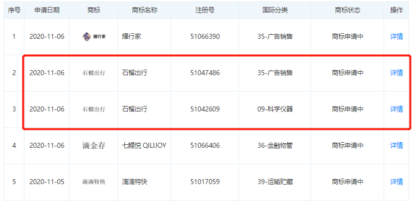 近日,滴滴關聯公司北京嘀嘀無限科技發展有限公司申請“石榴出行”商標,申請日期為11月6日,國際分類涉及廣告銷售和科學儀器,商標狀態為“商標申請中”。