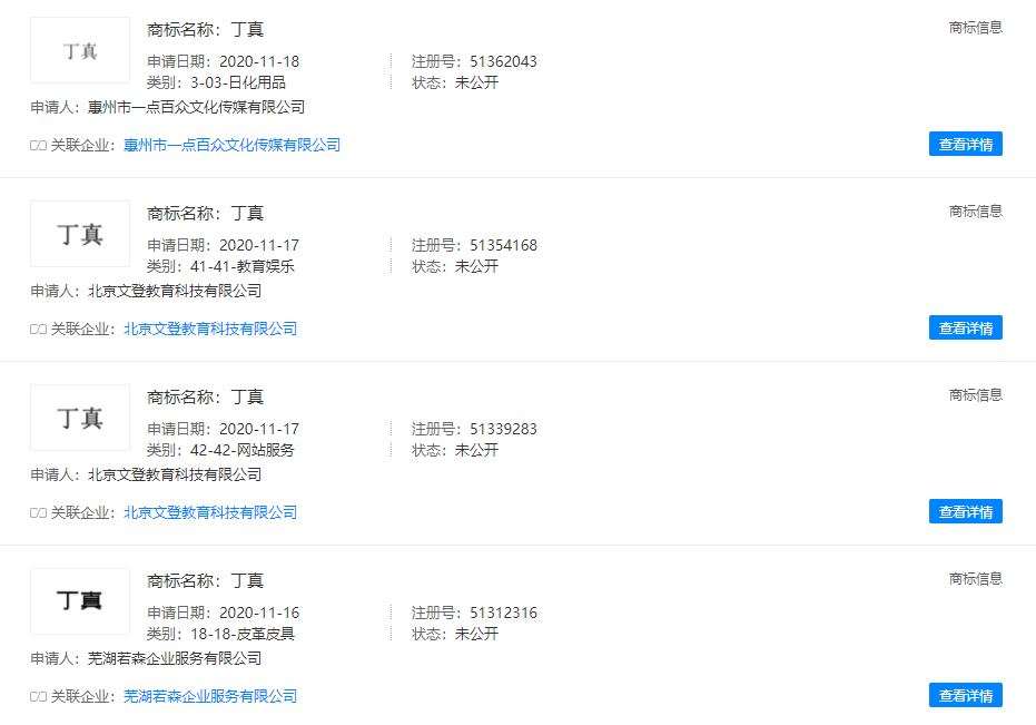 11月以來,“丁真”商標已被多家公司搶注,包括惠州市一點百眾文化傳媒有限公司、北京文登教育科技有限公司、蕪湖若森企業(yè)服務有限公司等,類別涉及日化用品、教育娛樂、網(wǎng)站服務等。