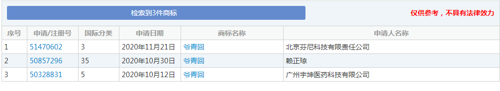 據悉,“爺青回”已被申請注冊商標,國際分類為餐飲住宿、廣告銷售,商標狀態為“商標申請中”。此外,“爺青結”已被上海貓易網絡科技有限公司、云泊科技(廣州)有限公司、黑龍江省北集興生態農業發展集團有限公司等申請注冊商標,國際分類涉及餐飲住宿、科學儀器、酒、廣告銷售等,商標狀態為“商標申請中”。