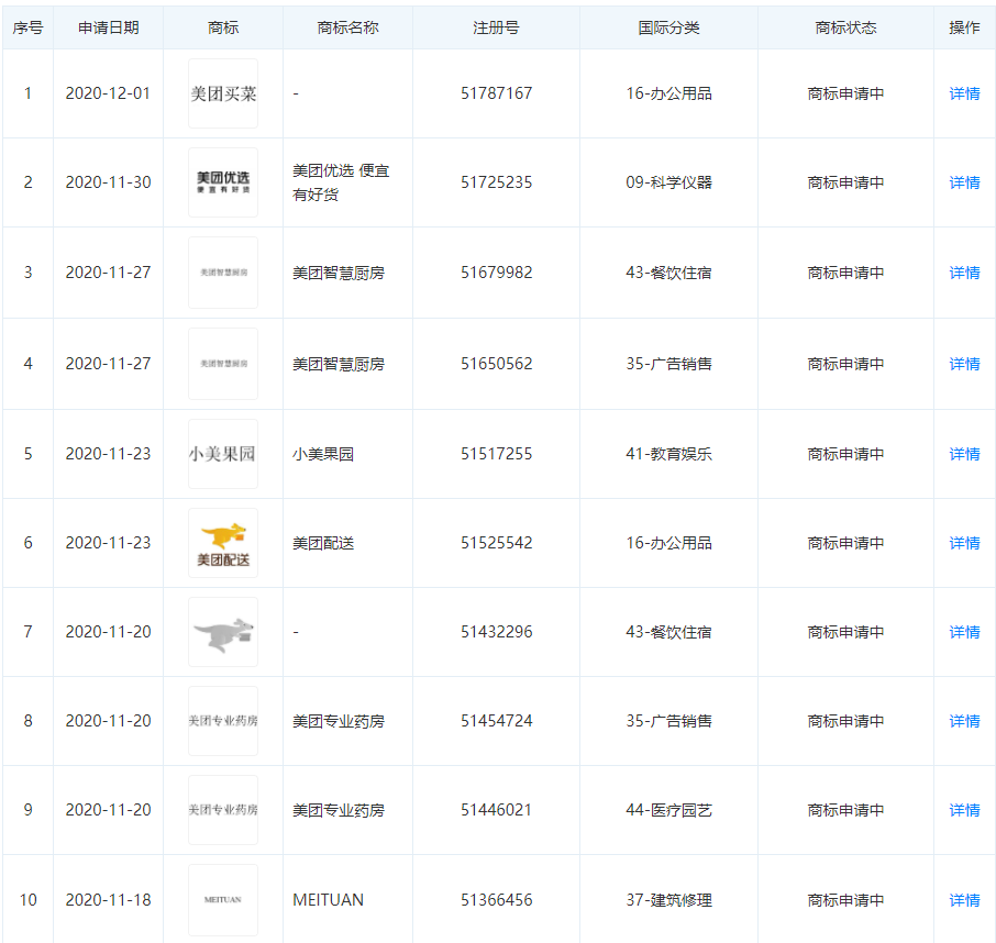 近日,美團關聯公司北京三快科技有限公司新增多條商標申請信息,新申請商標包括“美團智慧廚房”、“美團優選便宜有好貨”、“小美果園”等。商標國際分類涉及廣告銷售、教育娛樂、餐飲住宿、科學儀器等。