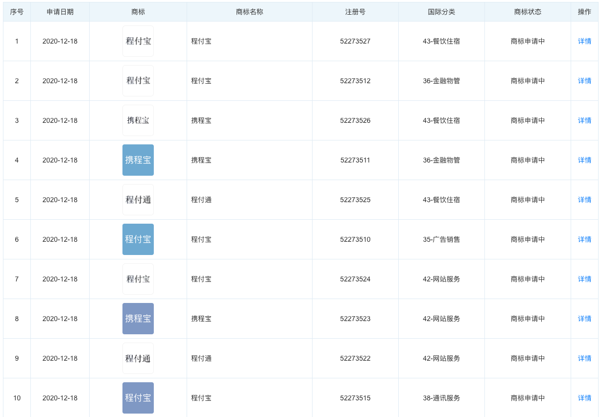 近日,上海攜程商務有限公司新增多條名稱為“程付通”“程付寶”“攜程寶”的商標申請信息,國際分類涉及金融物管、餐飲住宿、網站服務、運輸貯藏等。目前商標狀態均為:商標申請中。