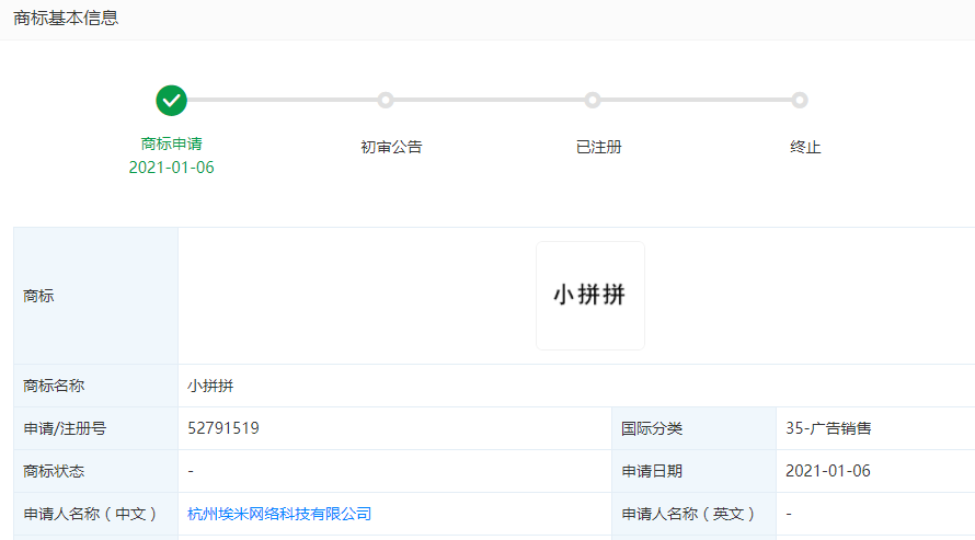 近日,拼多多關聯公司杭州埃米網絡科技有限公司新增“小拼拼”“團好貨”商標申請信息,國際分類分別為廣告銷售與科學儀器,申請日期為2021年1月6日,商標狀態顯示為“商標申請中”。