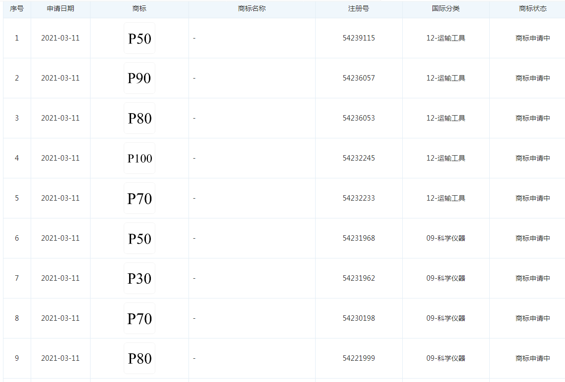 近日,華為技術有限公司申請注冊“P50”、“P60”、“P70”、“P80”、“P90”、“P100”等商標,國際分類為涉科學儀器、運輸工具,商標狀態為“商標申請中”。